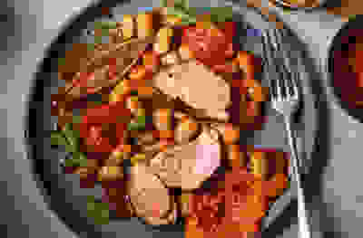 Lamb neck fillet with tomatoes, shallots & butter beans