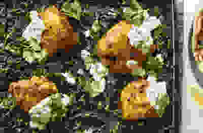 Crushed potato & halloumi traybake with summer veg