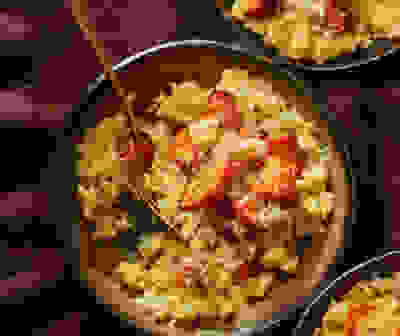 Lentil & coconut soup with spiced tofu patties