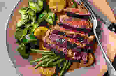 Grilled lamb steaks with mint, smoky butter & Mediterranean veg