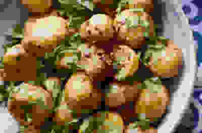 Curried potato salad with soft-boiled eggs & smoked mackerel