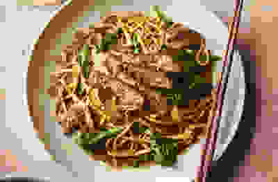 Fiery kimchi noodle stir fry with soft-boiled eggs