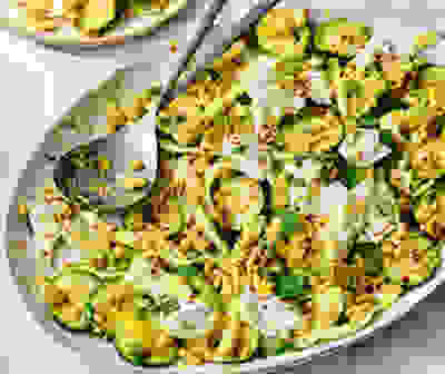 Caramelised courgette pasta with crispy crumbs & mozzarella