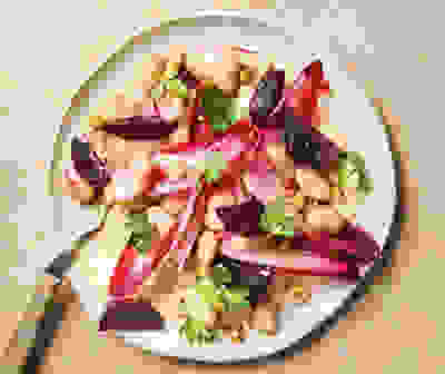 Toasted feta & pecan grain salad with cherries, green beans and herbs
