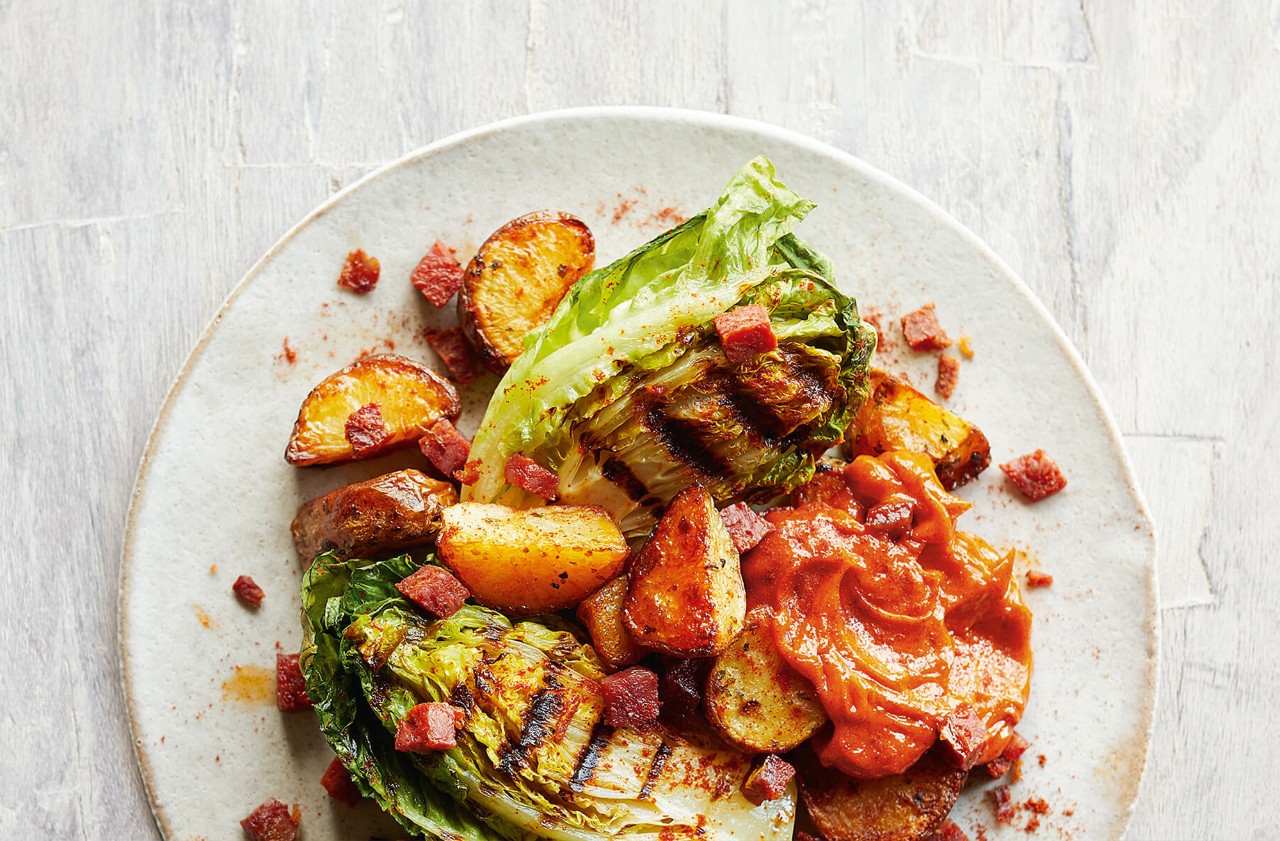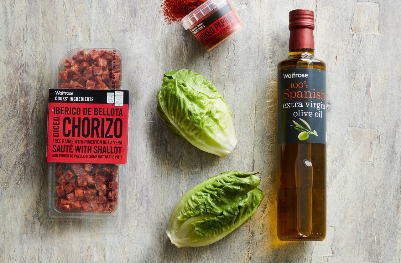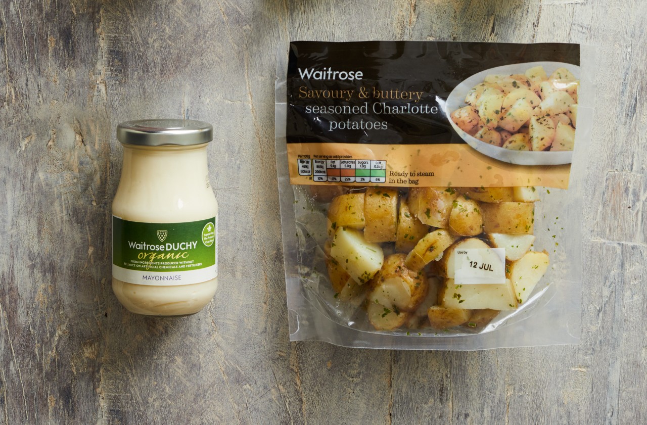 Preheat the oven to 200ºC, gas mark 6. Mix together the mayonnaise and paprika and set aside, stirring occasionally. Place the potatoes in a medium roasting tin with the butter discs from the pack and the diced chorizo, toss in half the oil. Roast for 30 minutes, turning halfway through until golden.