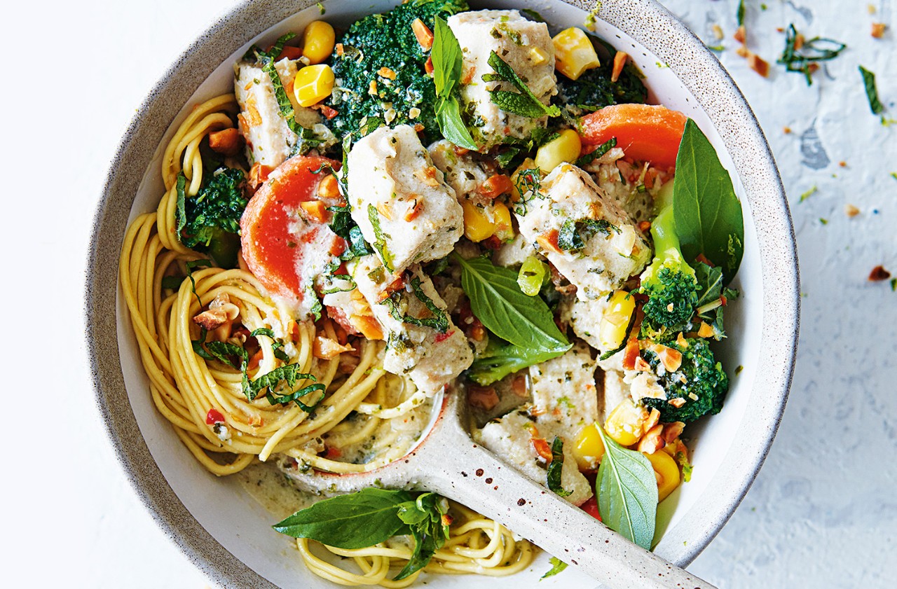• 1 tbsp vegetable oil • 3 tbsp Cooks’ Ingredients Frozen Thai Mix* • 400ml can essential Waitrose Reduced Fat Coconut Milk • 280g pack Quorn Vegan Pieces • 3 x 160g Waitrose Frozen Fine Cut Vegetable Steamers • Small handful fresh Thai basil leaves, larger leaves torn • 1 tbsp shredded fresh mint • Zest and juice of 1 lime • 2 tbsp roasted peanuts, chopped • 300g noodles or steamed rice to serve